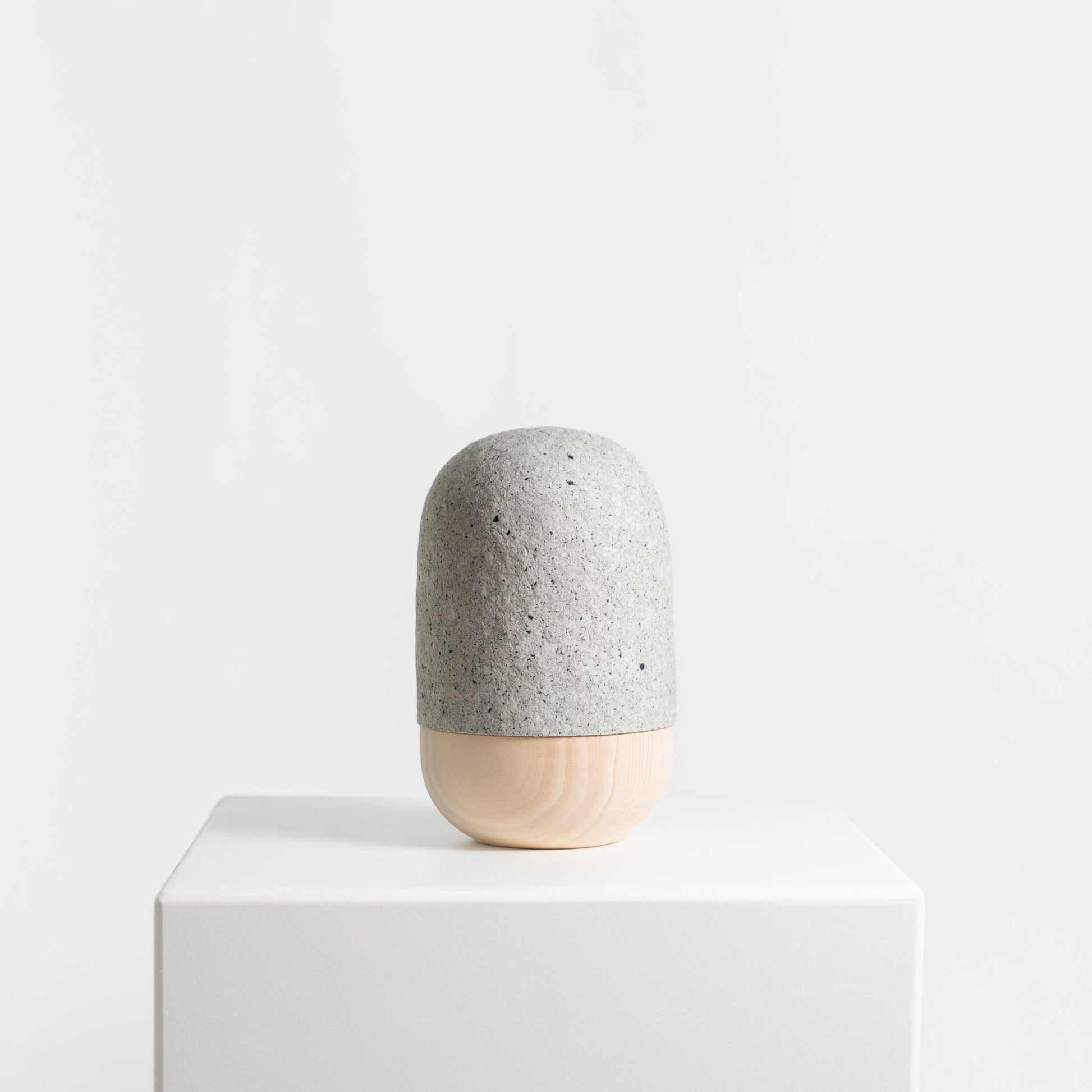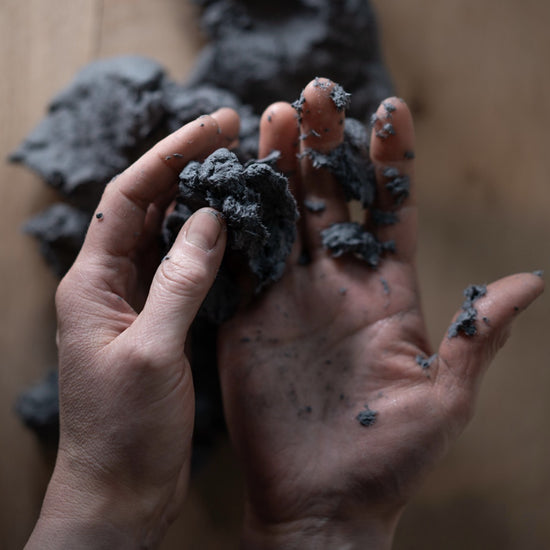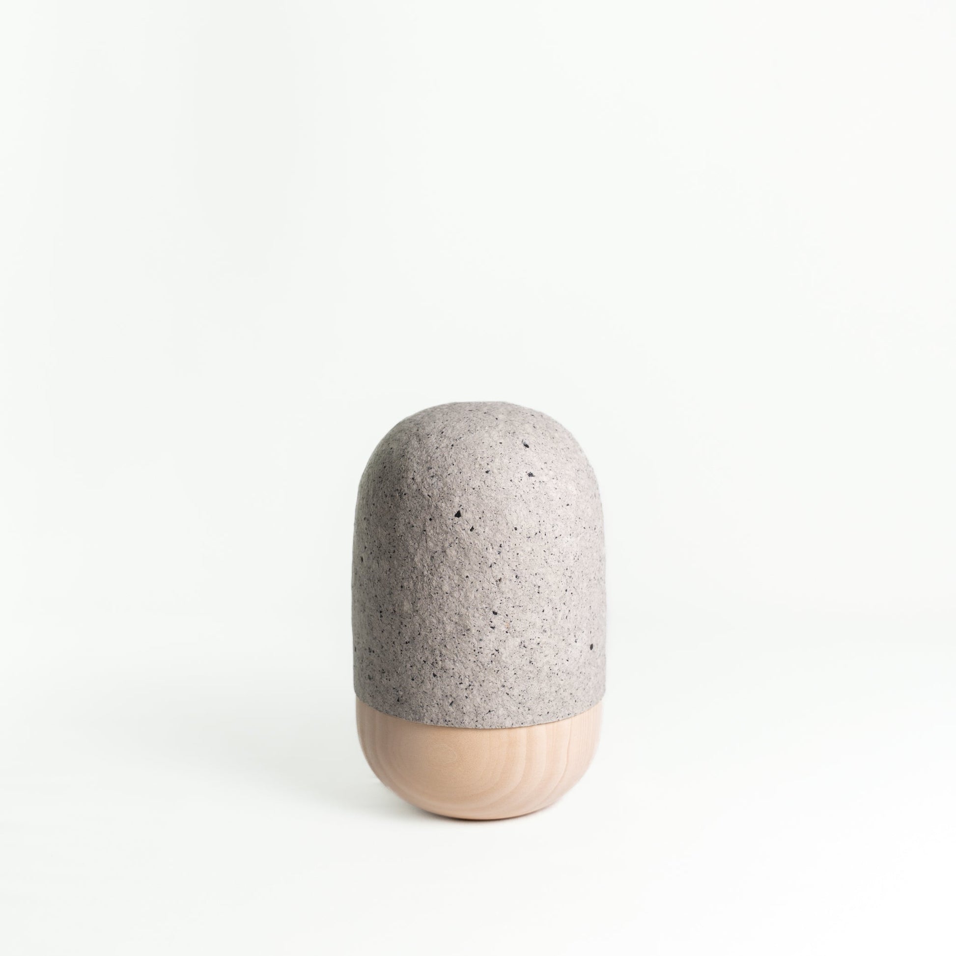 Naturpigmente gesammelter Schiefer bestimmen die Färbung und Struktur dieser Urne. Nach der Trocknung der Pulpe wird die überraschend stabile Urnenhaube auf die gedrechselte Lindenholzschale angepasst. Eine Emulsion auf Algenbasis schützt die Urne während einer Beisetzung von 20-40 Minuten vor Feuchtigkeit. Es ist aber darauf zu achten, die Urne nicht gänzlich ungeschützt im Starkregen zu platzieren. Pulp ist ein vergängliches Material und die Entscheidung für eine T'URN schließt den bewußten Umgang mit dieser Eigenschaft mit ein. Die Algenemulsion zersetzt sich im Erdreich rückstandslos.